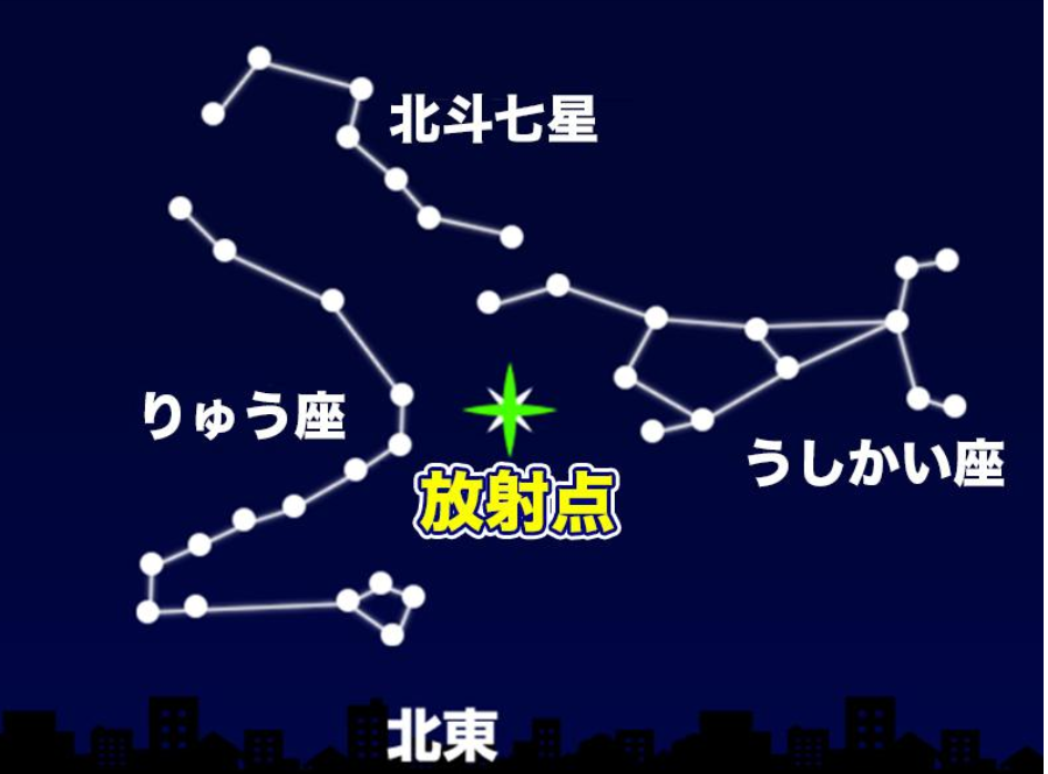 方角は北東です!「しぶんぎ座流星群」の流星は放射点を中心に放射状に出現します。