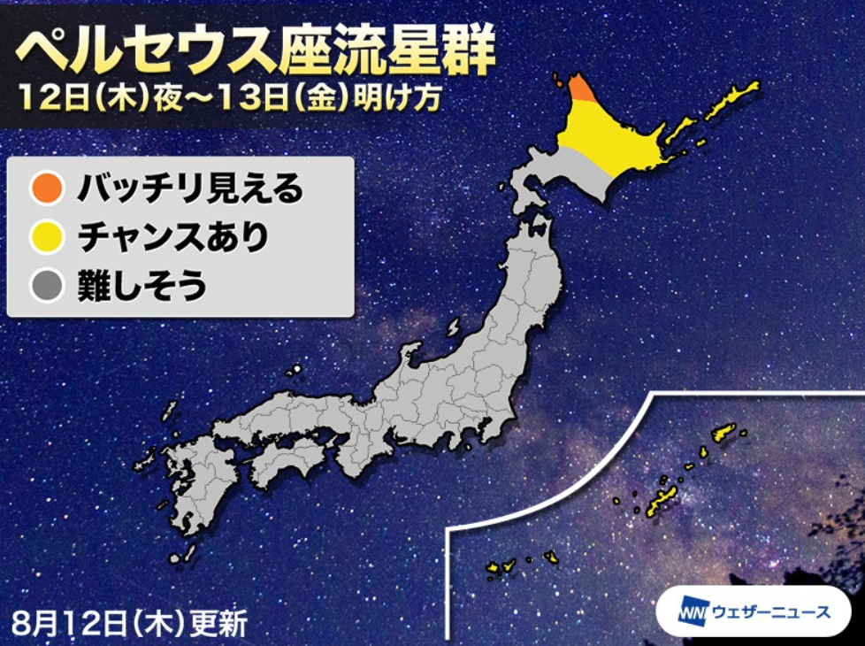 - 出現期間は7月17日(土)~8月24日(火)です、遅い時間ほど多くの流れ星を観ることができるということです。