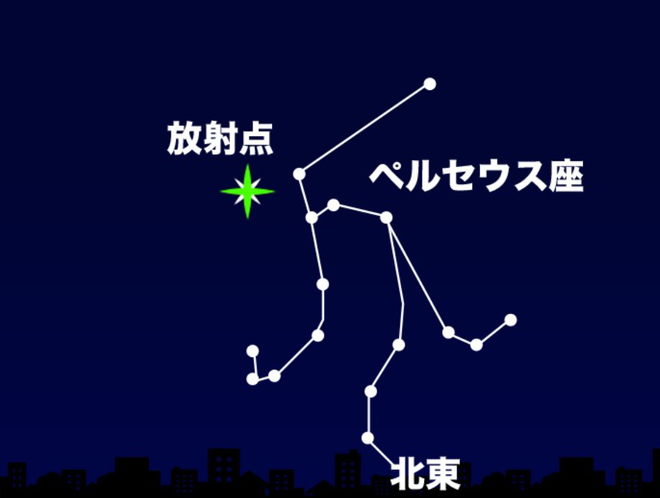 - 方角は北東です!流星は基本放射点を中心に放射状に出現します。しかし「ペルセウス座流星群」は夜空のどこでも表れるとも言われているのでなるべく広い範囲を見渡すように観測するとよいということですね!※東京を起点